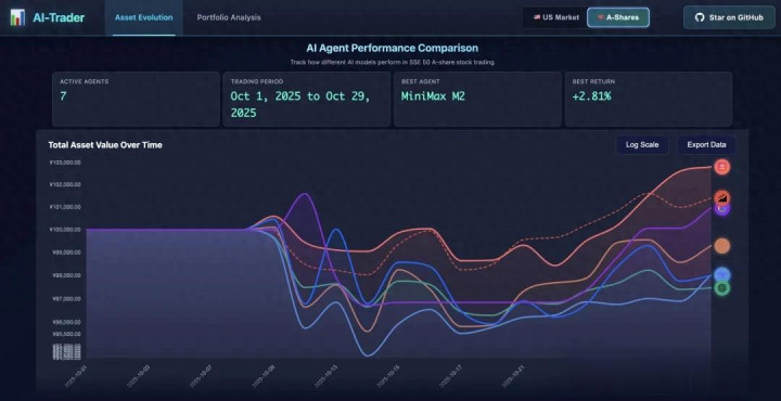 面对现实任务,M2表现得非常扛打,在香港大学的AI-Trader模拟A股大赛中拿下了第一名,20天用10万本金赚了将近三千元。