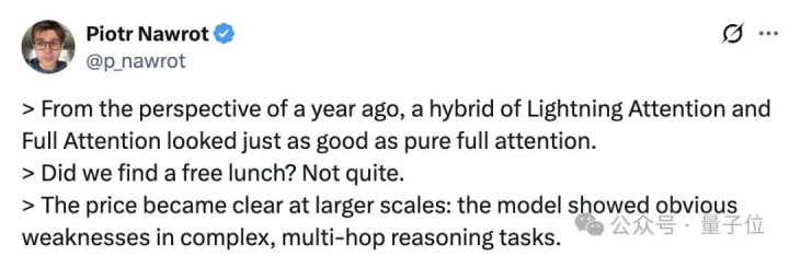 比如这位网友过去就认为,Lightning Attention与Full Attention混合起来效果和纯Full Attention是一样的,但他现在发现,对于复杂任务而言根本不是这么回事。