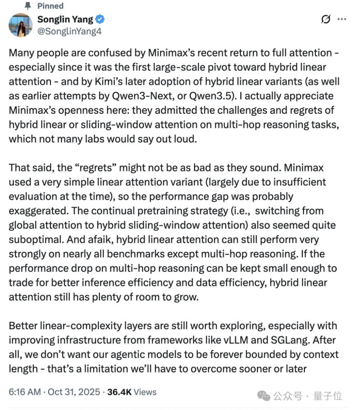 加上M2的上一代M1用的就是Linear Attention,这次却换了方案,更是给这个选择添上了几分神秘色彩。